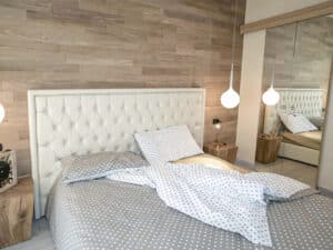 • Een tweede slaapkamer met tweepersoonsbed en een eenpersoonsbed, naast een derde badkamer