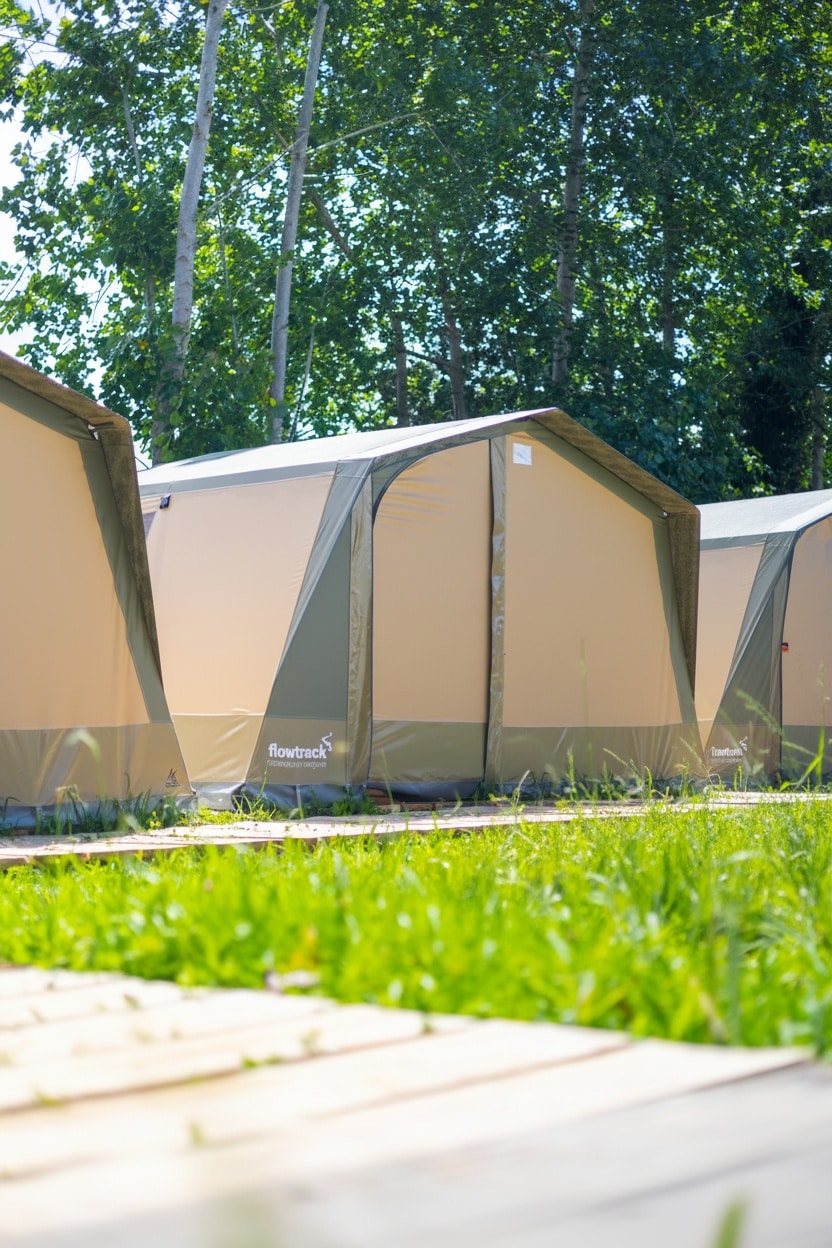 Je verblijft in ruime 4-persoonstenten. De douches en toiletten zijn privé en alleen toegankelijk voor Flowtrack gasten.
