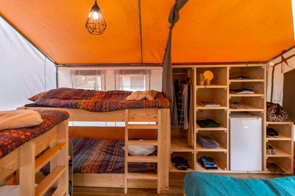Kies voor een op-en-top glampinggevoel in deze perfect uitgeruste safaritent. De lodge staat op een houten platform en is voorzien van een tweepersoonsbed, een stapelbed en een enkel bed. Er is een kleerkastje en een kleine koelkast. Op het terras staan een tafel met stoelen. De tenten zijn ruim opgesteld, met voldoende ruimte en privacy.